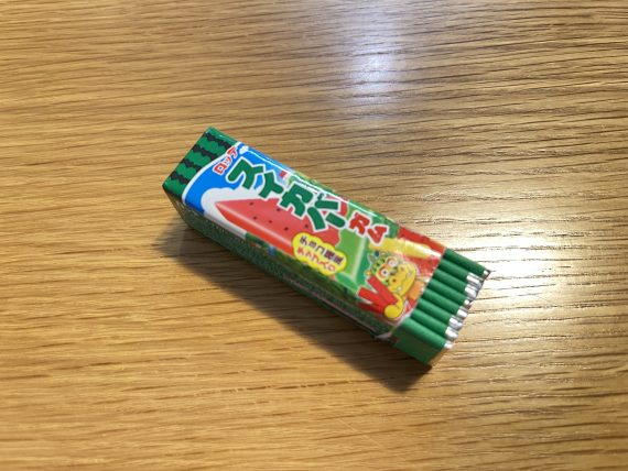 一気に暖かくなってきましたね。既に半袖の人もチラホラ。そんな中、夏先取りのこちらをゲットしました。いつも通りミーティングを始めようと準備していたら社長がおもむろにくれました。スイカ好きの私に毎年スイカをくれるのですが、今年はスイカバーガムで先取り!夏になったら本物のスイカもくれることを切に願います。