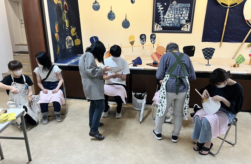 うちわ作り最後の工程は、ふちに「へり紙」と呼ばれる細い紙を貼り付けていく作業です。糊を塗ってある3mm程の薄い紙を貼るのは、かなり神経を使いました・・・。ミュージアムの方々にお手伝いいただきながら、みんな思い思いに自分のうちわを仕上げていくのでした。