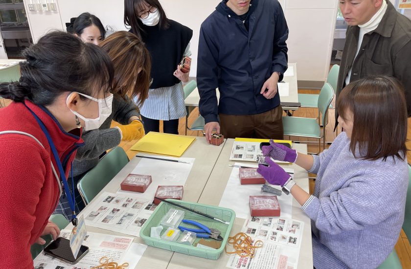 溶かした金属を型に流して数分…。いよいよ型からの取り外し!磨く前の金属は白金のような色味がピカピカと輝いており、とっても綺麗でした。このあとはひたすら磨いて磨いて磨いて…の作業が続くわけですが、この段階で「おーっ!」と感動の声があがりました(笑)
