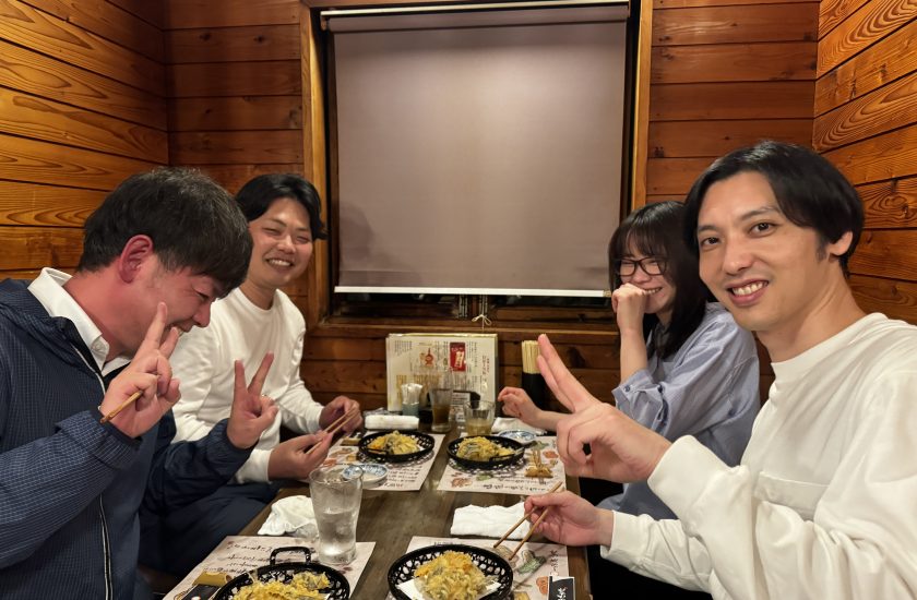 業務の無駄を無くし、より良く仕事を進めるための「振り返り会議」をみんなで頑張った後は、恒例の懇親会です。ひとつひとつの料理も美味しかったですし、1月ぶりの全体懇親会と言うことでワイワイ楽しい時間を過ごしました。みんなの自然な笑顔が良い感じですね!