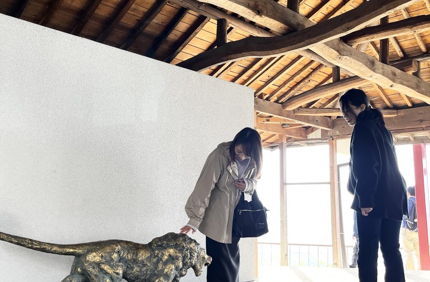 屋島山頂の展望台の下には「獅子の霊巌」と呼ばれる岩があり、獅子が海に向かって咆哮しているように見えることからこの名前がつけられたそうです。この展望台でかわら投げを楽しんだ後、散策していると獅子の置物がありました!この置物も海に向かって咆哮していて、なんだかすごい迫力が。思わずみんなで獅子を撫でてしまいました。