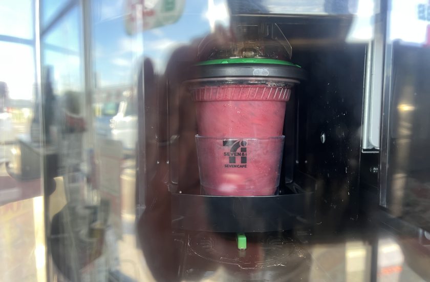 うまく撮れてなくてすみません。コンビニで作れるスムージーを買ってみました!4種類の中から選んだのはブルーベリー?ベリーベリー?なんとか!コーヒーと同じような機械にいれると中で砕いたり混ぜたりしてすぐに完成!こんなのがコンビニでできるなんて本当にすごい。そしておいしい!