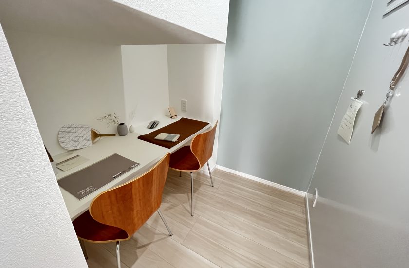 建物が完成して駐車場など外回りの工事中のリラクス川内12。先日もおこもり部屋をご紹介しましたが、今回は家具雑貨付きなのでイメージアップ!2人座れる十分なスペース。天井の低い部分がありますが、階段下のデッドスペースの活用としては十分過ぎる空間ができたと思います。